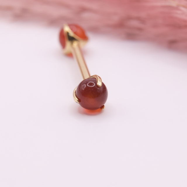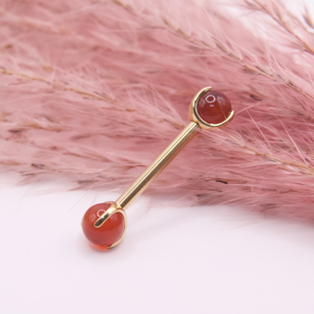 Barbell pour piercing téton en pierre naturelle - Red Agathe en titane ASTM-f136 avec revêtement PVD (pour la version dorée). Pas de vis interne.