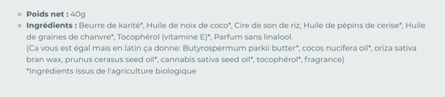 En cas d'exposition à la chaleur, la texture de votre baume peut varier mais elle n'altèrera en rien son efficacité. Comme sa formule naturelle ne contient pas de stabilisants, elle peut être sensible aux changements de température.